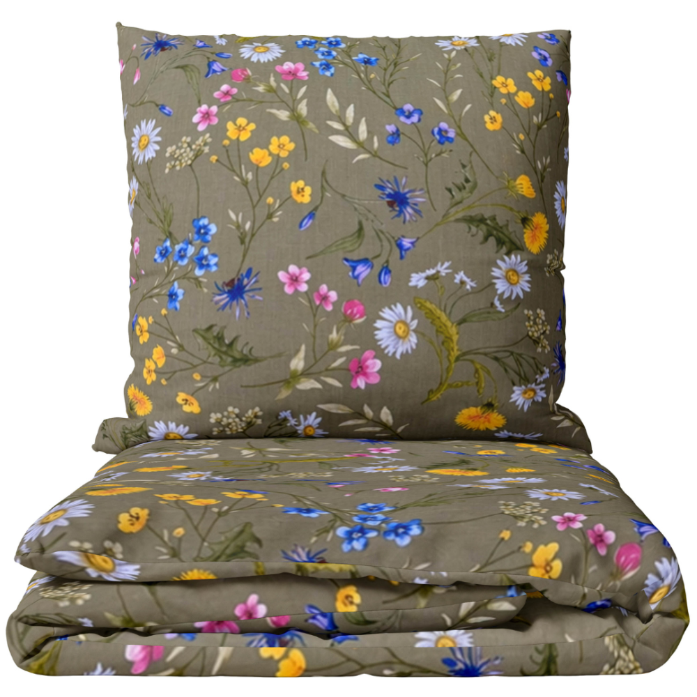 Vihreä vuodevaatesetti erottuu pehmeällä oliivin sävyllä ja hienovaraisella niittykukkakuviolla. Valkoiset päivänkakkarat, siniset ruiskukat, keltaiset voikukat ja vaaleanpunaiset luonnonkukat luovat luonnollisen ja romanttisen tunnelman. Hillitty vihreä tausta tuo rauhaa, kun taas värikkäät kukat lisäävät elävyyttä ja lämpöä. Muotoilu tuntuu kevyeltä, raikkaalta ja hyvin luonnolliselta, sopien täydellisesti sekä moderneihin että kodikkaisiin makuuhuoneisiin.
